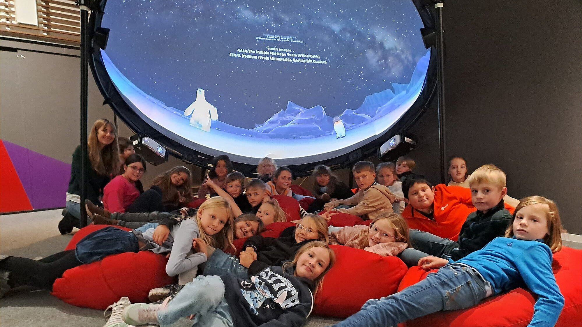 Zum Abschluss tauchten wir in eine ganz andere Welt ein: Im audiovisuellen Mini-Dome erlebten wir einen faszinierenden Film, der uns hinter die Lösung des folgenden Rätsels führte: Warum ist an Süd- und Nordpol jeweils ein halbes Jahr Tag und ein halbes Jahr Nacht?