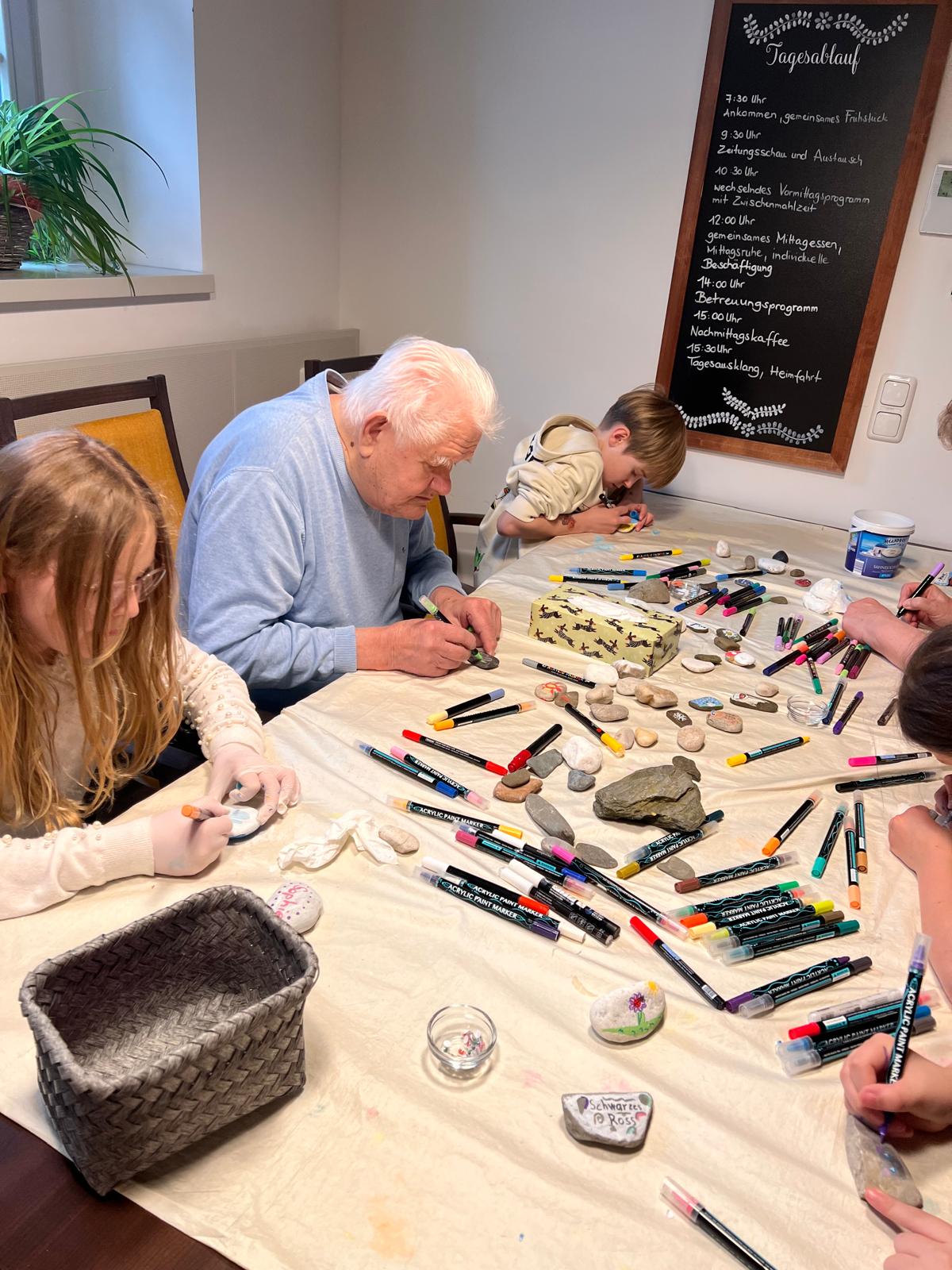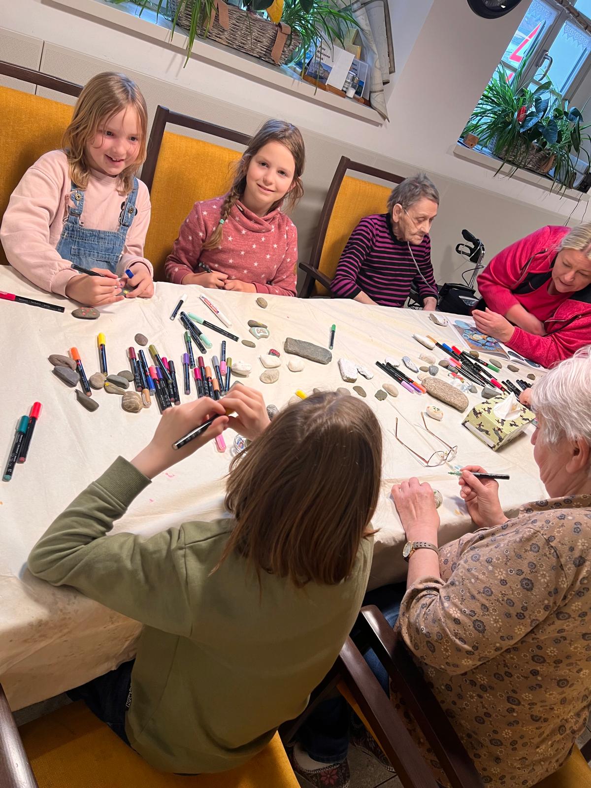 Ein kreatives Projekt stand am 14. April auf dem Programm: Ein Teil unserer Drittklässler besuchte die Tagespflege Kasendorf, um dort gemeinsam mit den Seniorinnen und Senioren Steine in kleine Kunstwerke zu verwandeln.